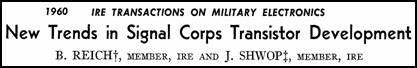 Bernie was co-author, as shown above, of the first comprehensive paper describing the groundbreaking work done by the Signal Corps to promote early transistor development. Shown below is a section of a 1956 ad in Electronics magazine illustrating the first high frequency (HF) transistor to be qualified for U.S. Army use. This work is discussed in the article shown above, as are many other early transistor types and military applications.
