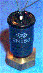 NOTES The CBS Hytron 2N156 was an early entry in the germanium power transistor market. It used a unique cylindrical shape, with a large threaded insert which allowed a massive brass flat headed bolt to be used to mount the transistor to a heat sink – the large bolt allowed heat to travel down the bolt where it would contact the other side of the heat sink. The 2N156 was one a series of similar transistors, which included the 2N158 and 2N158A. The 2N158 was widely used in the military in the 1950s and was designated a JAN device. Raytheon bought out the CBS Hytron company in the late 1950s, and continued to manufacture this series through the 1960s. The 1962 Lafayette Radio catalogue lists the CBS 2N156 for $3.75 and the 2N158 for $5.25. |