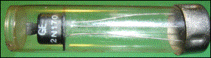 NOTES General Electric introduced the 2N170 in June 1956. According to the press release which announced the 2N170, “ A new high frequency transistor for radio hobbyists and do-it-yourself devotees, priced about the same as its nearest comparable electron tubes, was announced…Designated the 2N170, the new transistor is the second in a series of transistors especially designed by GE for use by electronic hobbyists. It will amplify radio signals at frequencies up to 4,000,000 cycles. The new GE 2N170 high frequency transistor is being sold at considerably less than $2.” This transistor, along with the previously announced 2N107, became favorites with hobbyists and experimenters, and many articles appeared in the electronics magazines of the time with projects using both these transistors. The 1960 Lafayette Radio Semiconductor catalog lists the 2N170 at $1.30 each. The earliest 2N170 units had the distinctive GE “pinched top” metal case style with a somewhat unusual “bath-tub” shaped oval base. Later units were made without the “pinched top”. These units were very rugged and the hermetically sealed metal cases protected the transistor junctions from moisture and deterioration – most currently existing units are still functional. |