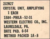 HISTORIC NOTES The 2N27 is an interesting device from the first days of transistor manufacturing at Western Electric. Developed in the mid 1950s, the 2N27 illustrates the early efforts to develop a metal case which was capable of protecting the internal transistor junction from temperature and humidity. As can be seen in the photo shown above, the cases were crudely constructed, with what appears to be hand-soldered areas at the case bottom. The leads of the 2N27 are embedded in a glass header, which undoubtedly contributes to the hermetic seal of the device. Also of interest is the method used to identify the transistor model – some of the early units were marked with color-coded paint dots to indicate model 2N27. The standard electronic color code uses “Red” for “2” and Violet” for “7”. The 2N27 saw very limited use in phone equipment and was likely out of production by the late 1950s. An additional important historical fact relating to the 2N27 is that this was the first “2N” type assigned to a junction transistor. The earlier “2N” numbers, 2N21 through 2N26, were all associated with point contact transistor types. |