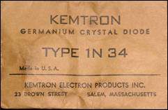 HISTORIC NOTES The 1N34 germanium crystal diode had been originally introduced by Sylvania in 1946, and soon became a large commercial success. Into the 1950s and 1960s, many electronics manufacturers began to offer their own versions of this device. KEMTRON was one of those companies to “second-source” the 1N34. Shown above at top left are examples of the KEMTRON 1N34; note the white ceramic case, which is similar in style to the original case style used by Sylvania in the 1940s. The paper packaging for the device is also shown, and lists the address for KEMTRON as Salem, Massachusetts. Little is known about KEMTRON, which did not advertise extensively in electronic publications and apparently did not offer much in the way of product documentation. It is possible that KEMTRON was formed by ex-Sylvania employees, who were familiar with diode technology. (Note that an early Sylvania semiconductor facility was located close by in Woburn, Massachusetts). KEMTRON manufactured a variety of germanium and silicon diodes into the 1960s – the manufacturing facility was sold to the city of Newburyport in 1980 and demolished in 1981. KEMTRON diodes are truly unique and represent a classic technology, manufactured by a little known and historic company. |