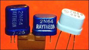 Shown above are three different 2N64 transistors. The Raytheon “Shortie is very rare and is likely a pre-production prototype. (Dated 4-47 on back of case). |