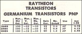 Raytheon introduced the 2N6X line in 1954, and several other companies soon offered second source devices, including Tung-sol with a Robin’s Egg Blue version (see above photo). Other companies included General Transistor, Transitron and ETCO. The Lafayette Semi-Conductor catalogue from 1960 (see excerpt above right) lists the 2N65 at $4.55, which is over $30 in today’s $! |