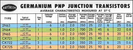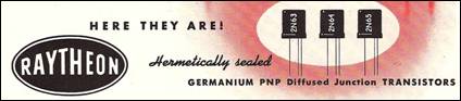 The mid 1950s saw numerous industry announcements of Raytheon’s new transistors. Above is section of a June 1955 Tele-Tech ad, which also included details specs on the 2N6X line. At bottom left is a section of a Feb 1955 ad from the Proc of the IRE, touting the virtues of hermetic sealing. The colorful comparison chart at left is from a 1950s Raytheon catalogue, and provides a useful spec list. |