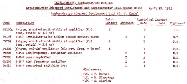of the engineers who were assigned to each of the transistor types. Note that Norm Ditrick was assigned the
