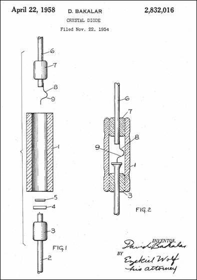 With this above patent, filed on Nov 22, 1954, David Bakalar provided a sound technical description of an improved gold bonded germanium crystal diode. As noted earlier, David correctly predicted that if a stable diode of this type could be manufactured, there would be a large commercial market. The diode structure defined in this patent in fact did result in high reliability, high performance germanium gold bonded diodes that were the basis for Transitron’s first and very successful product offering.