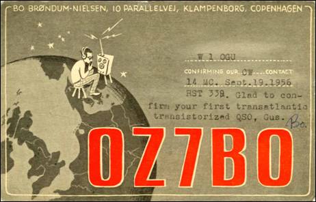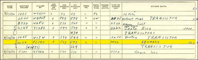 DOCUMENTING THE HISTORIC TRANSMISSION The exchange of QSL cards by the two communicating parties involved in an amateur radio contact is the standard method for documenting the contact. The QSL cards are typically the size of a post card and are mailed using the postal system. The cards contain the basic information relating to the actual radio contact. Shown at top is a scan of one side of the QSL side mailed to Gus Fallgren by Bo Brondum-Nielson from Copenhagen confirming the first transistor transatlantic contact. Amateur radio operators also maintain a formal log of their contacts, and shown above is a section of Gus’s log from September 1956. The yellow highlighted section documents the first contact at 20:42 Eastern Time, on 9/18/56. Note the QSL card has a Sept 19 date, which reflects the six hour time difference between Chelmsford and Copenhagen. The contact was done on the 20 meter (14 MC) frequency band. |