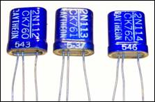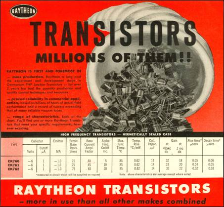 RAYTHEON TRANSISTORS At upper left is a section of a 1955 Raytheon ad, confirming leadership in germanium transistor technology. New “high frequency” devices - the CK760, CK761 and CK762, using the PNP fusion alloy process, were now available. Shown above are production versions of these devices, all dated 1955. Raytheon used a proprietary “CK” numbering system, and early devices used this and the standard “2N” system. The Transatlantic Transmitter used two 2N113/CK761 transistors, rated at 10MC high frequency capability. The “ES” samples used in the transmitter were provided by Frank Dukat, who was the transistor product manager in Norm Krim’s Semiconductor Products group. The striking iridescent blue color of these early Raytheon transistors, and the equally appealing cardboard packaging (shown above) are easily identified characteristics of historic Raytheon germanium devices such as the CK761 and the more famous CK722.