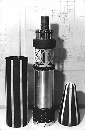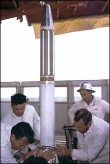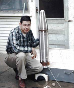 The above photograph is from 1958 and displays the partially disassembled Explorer Instrumentation package. Note the schematic diagram in the background, depicting the onboard transistor circuits. At right, above, is a photo showing actual installation of the Explorer 1 satellite on the Jupiter-C launch vehicle. At right, lower, is a photo of Dr. Ludwig holding the Explorer 1 backup satellite payload.