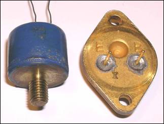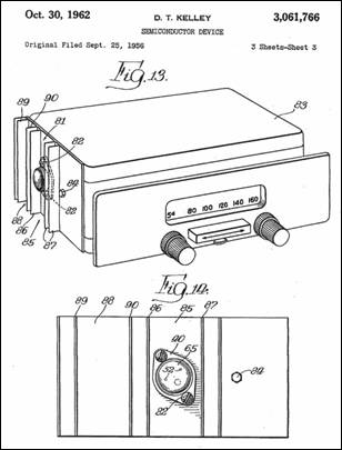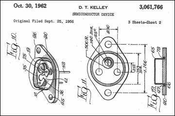Ralph recounts that one of the major contributions of the early Motorola transistor program was the development of the “diamond-shaped” TO-3 case style. He attributes the development of the TO-3 case format to Dale Kelley at Motorola. Shown above are segments of one of Dale’s patents (assigned to Motorola) relating to the TO-3. As shown, the power transistor could be bolted directly to the automobile radio case, which would act as heat sink. Other related Kelley TO-3 patents are 3060553 and 3142791. Ralph also mentions that the original Motorola prototype germanium power transistors used a stud mount. At right is a photo comparing one of the early Motorola stud mount prototypes with an early 2N176 TO-3 case. By the late 1950s, Motorola was manufacturing millions of TO-3 devices annually – this was the first major success for Motorola as a semiconductor manufacturer.