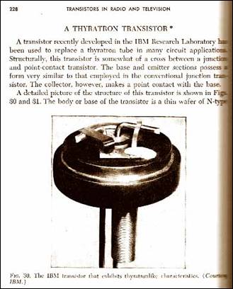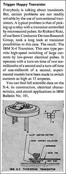 An early experimental IBM Model 604 'transistorized' (instead of tubes) computer was first shown in October of 1954, using circuit boards stuffed with transistors bought from outside sources. However, one experimental semiconductor device was made by IBM and this was called the "X-4". This was a 'thyratron type' transistor developed to control large currents as a relay driver. This device was invented by Richard F. Rutz while working at IBM and first mentioned in an AIEE-IRE Conference paper in June, 1955.