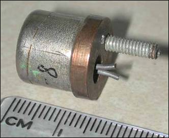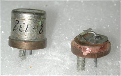 ABOVE: This is what was found once the outer case was removed. The interior matches exactly the devices described in the references on the previous page. The gray resin filled top concave surface can just be seen on the left device. This covers up the exhaust hole for the hermitic sealing.